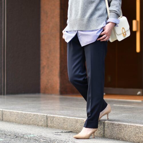 輪郭がはっきりとし、ネイビーパンツとの繋がりもメリハリ良く。