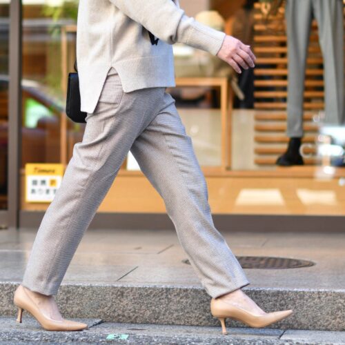 パンプスもベージュで揃えて、女性らしいスタイルに。