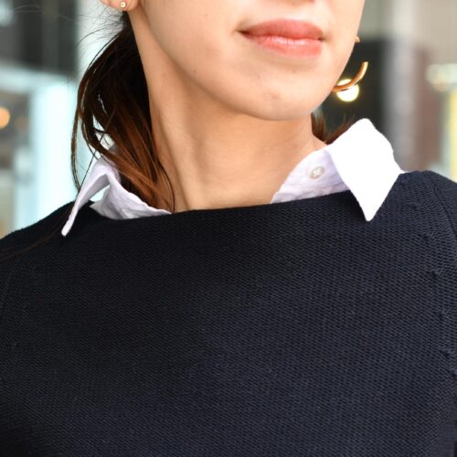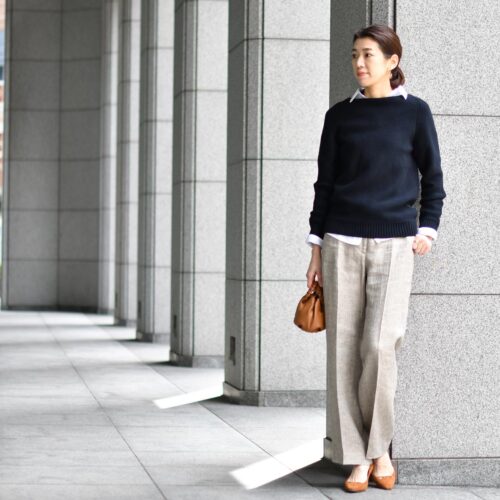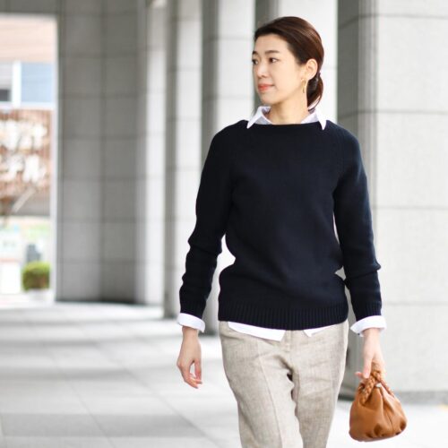 ネイビーのニット&ホワイトのリネンシャツのレイヤードで