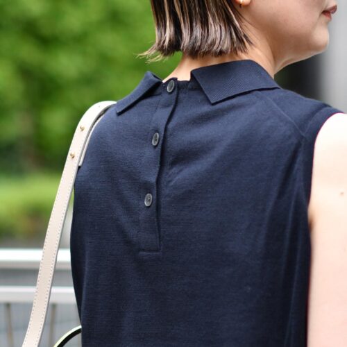 背面のボタンにより、襟元は程よくフィットしデザインのポイントになってくれています。