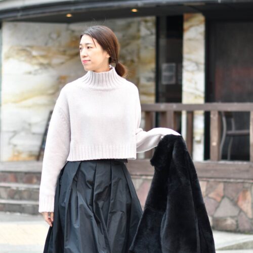 ボリューム感あるニットも合わせていただきやすいデザインです。