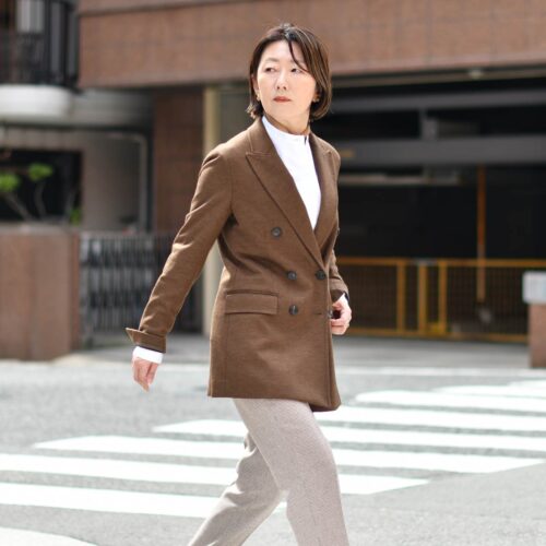 メランジ調ウールカシミヤの上品な生地感と、暗めのブラウンカラーが調和された