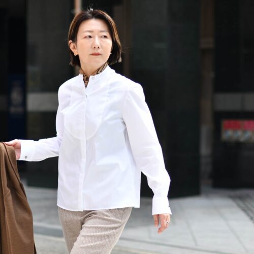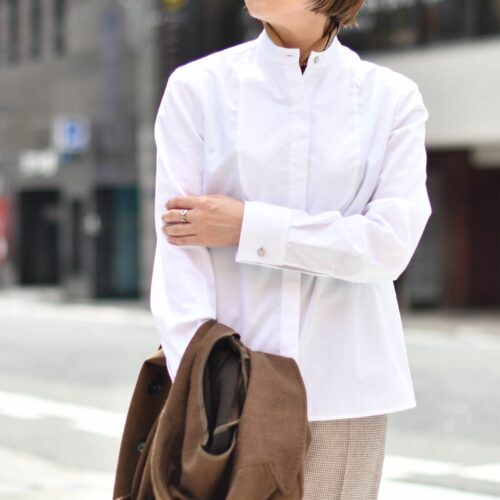 インナーは、白のブザムシャツでスッキリ清潔感を漂わせ