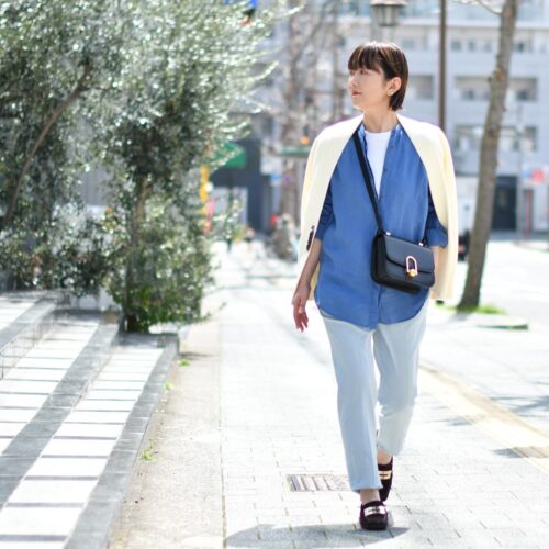 バッグとシューズはダークカラーで引き締め、爽やかにカッコよく。