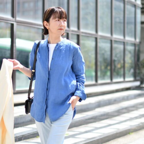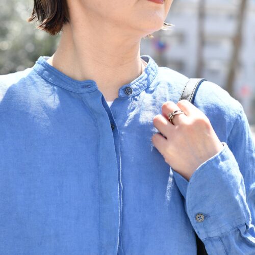 Baguttaのリネンシャツは、お顔まわりをスッキリ見せてくれるバンドカラーデザイン。