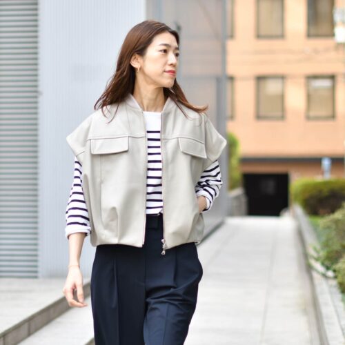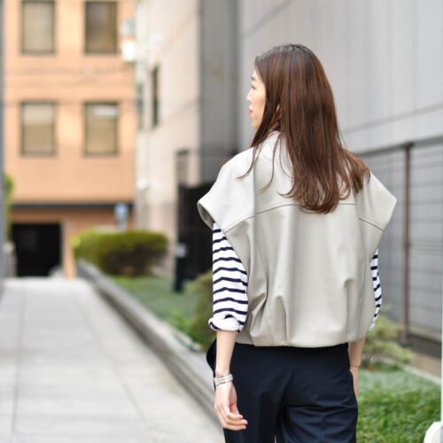 レザーの強さを優しく和らげ、大人の女性らしい柔和な印象を演出。