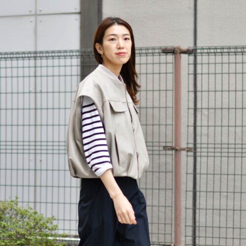襟元のリブ使いが軽快なニュアンスをプラスし、レザーアイテムをより日常に引き寄せます。