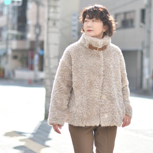 クルクルフワフワの巻き毛が特徴のスタンドカラーデザイン。