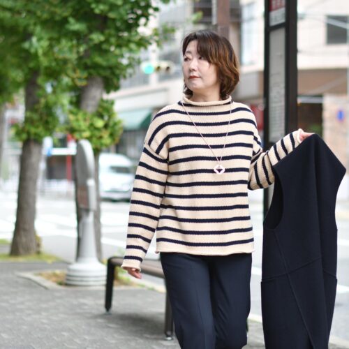 ボーダーニット×スッキリパンツのベーシックなスタイルも