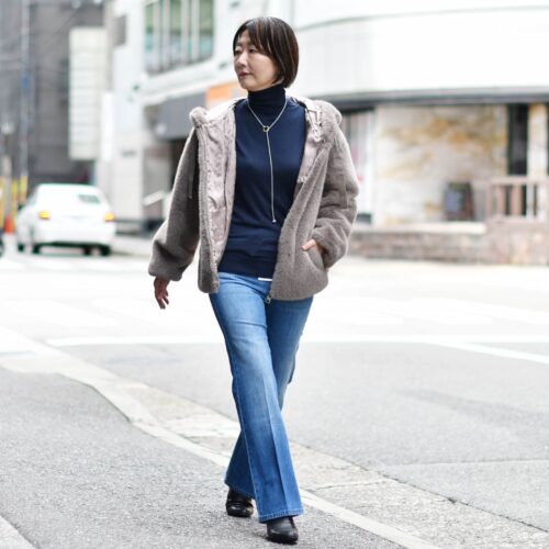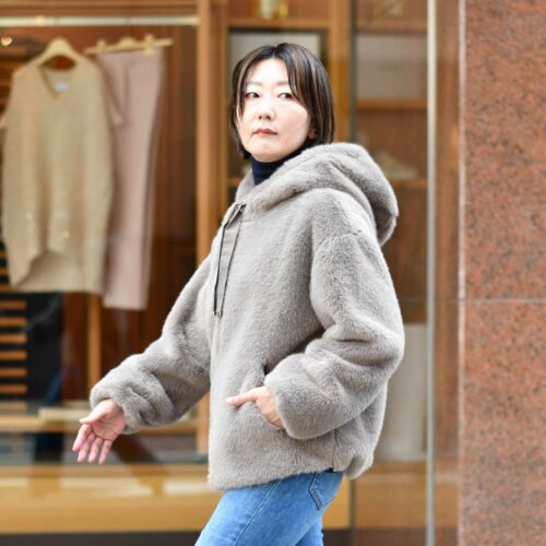 肌触り滑らかなエコファーを使用したフーデットブルゾン。