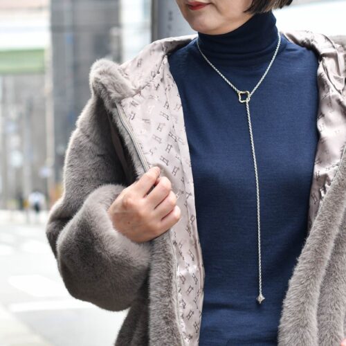 ラグジュアリーな雰囲気ながら、ドロップショルダーデザインにより