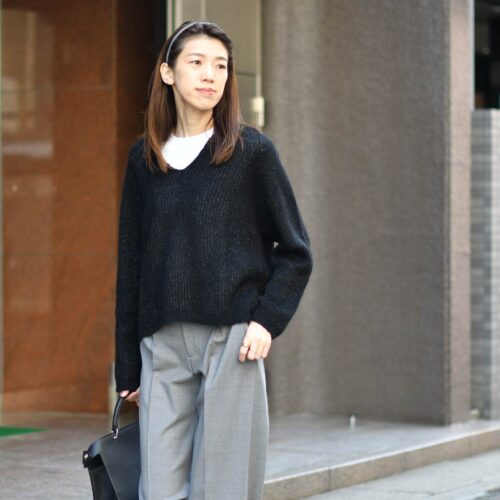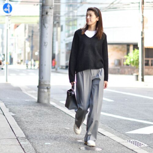 ボトムスはグレーのワイドパンツでモノトーンスタイル。