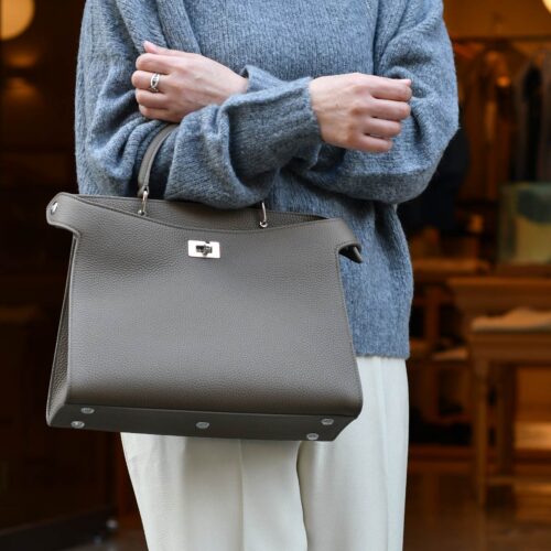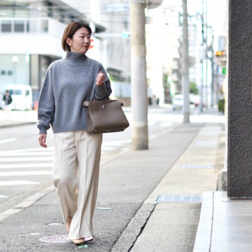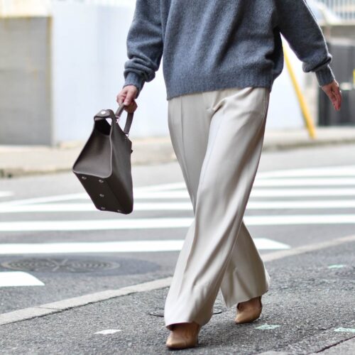 michino PARISのバッグが、グッとスタイリングに箔をつけてくれますね。