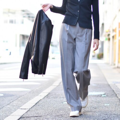 グレーのワイドパンツでモノトーンにスタイリング。
