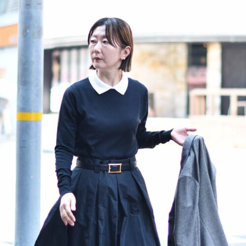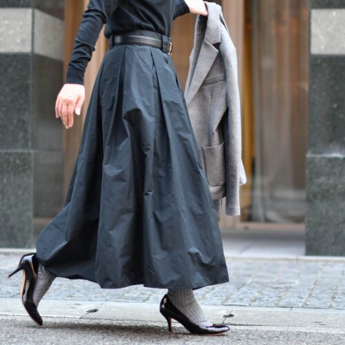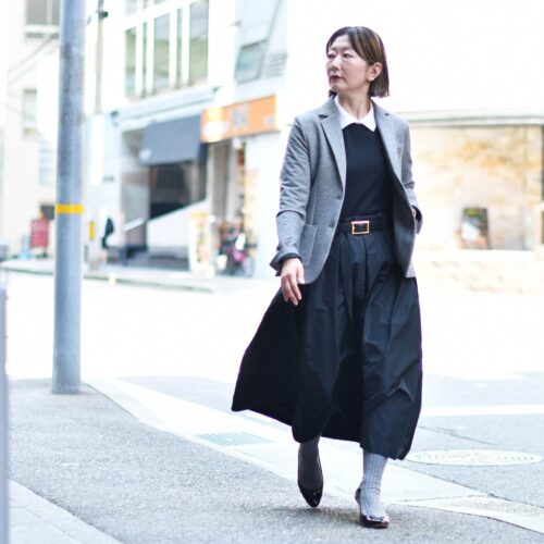 タックフレアーのスカートを合わせ、レディライクなスタイリングに。