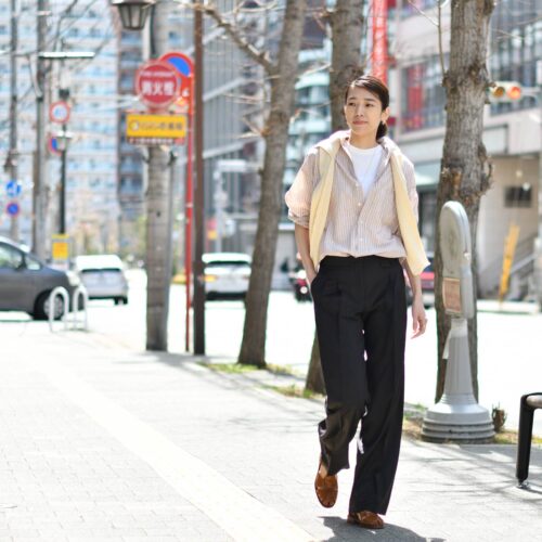 CellarDoorのブラウンのワイドパンツを使ったスタイリングのご紹介でございます。