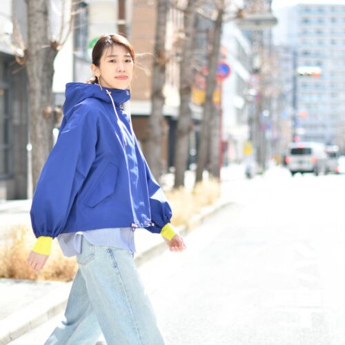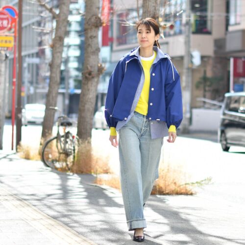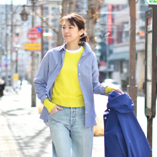 ボトムはブルー系で統一し、バギーデニムでスタイリング!