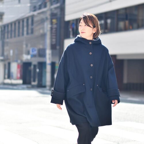 膝が少しのぞくくらいの丈感のオーバーシルエットのコートは