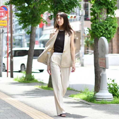パンツはコットンリネンのストライプパンツをセレクトし、