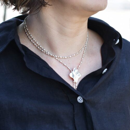胸元にはシルバーアクセサリーで艶めきをプラス。