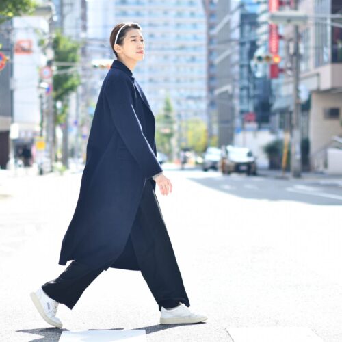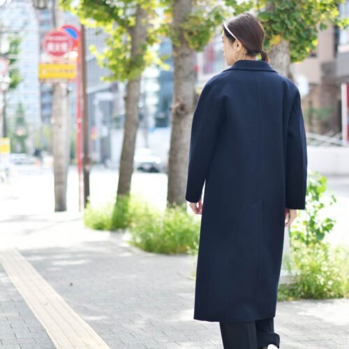 上質なウールが持つ柔らかさとしなやかなドレープが上品な印象もあり