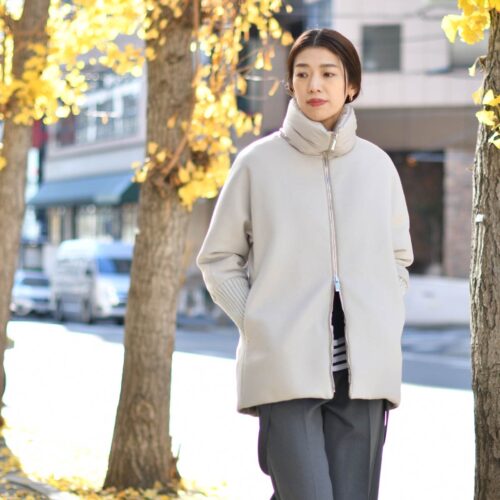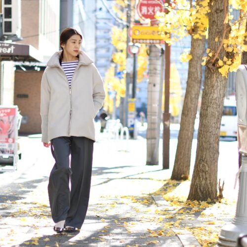 ボリューム感のあるアウターに対して、インナーにはボーダーのカットソーを合わせることで、軽やかさとマリンな雰囲気をプラスしています。