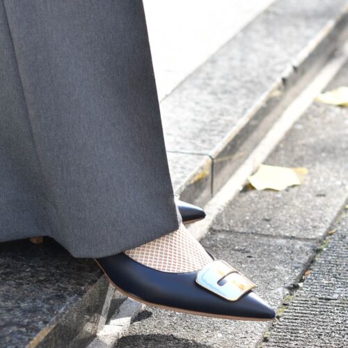 ボトムスには、あえて落ち感のあるワイドスラックスを選び、足元はストラップパンプスで抜け感を演出。