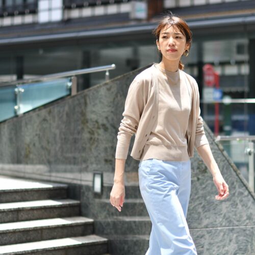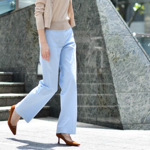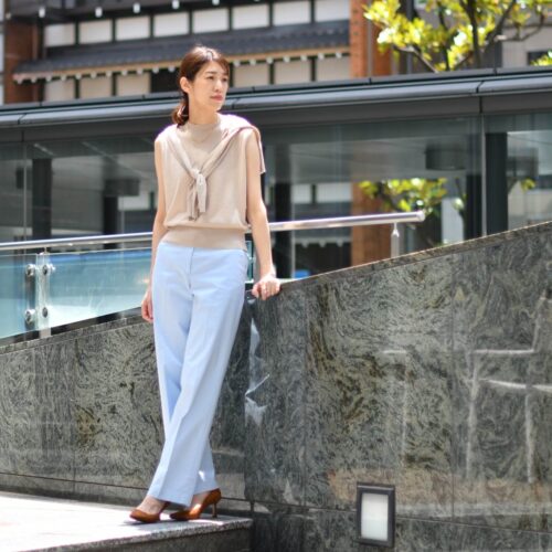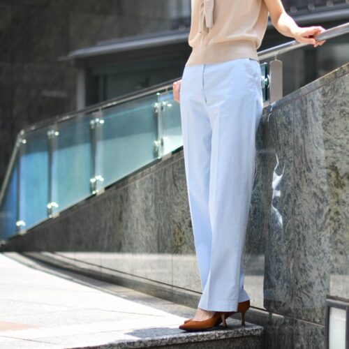 爽快なブルーのパンツを合わせて
