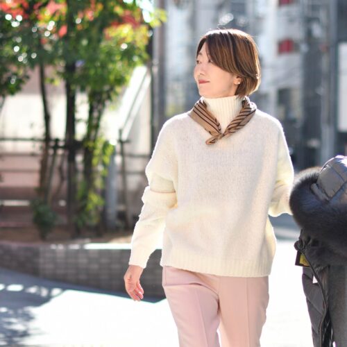 立ち上がりの綺麗なハイネックニットは、アウターを羽織った際もチラリとのぞき