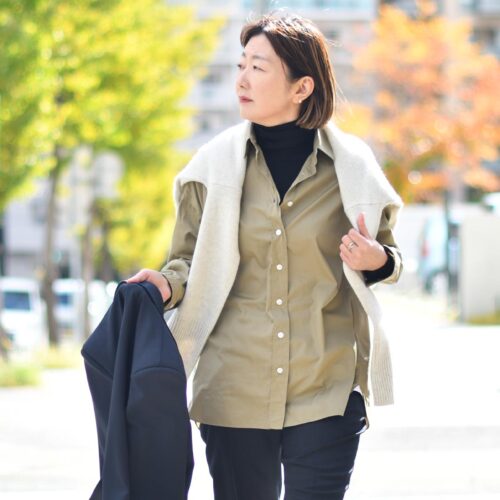 Finamoreのカーキ色シャツメインのスタイルも素敵ですよ。