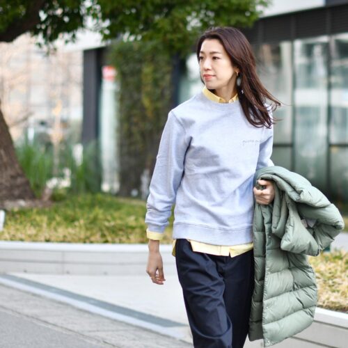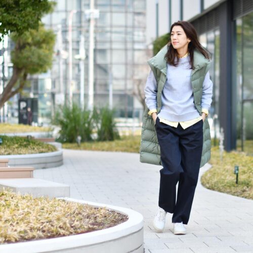 スウェットとダウンベストのスポーティーでカジュアルな印象ですが