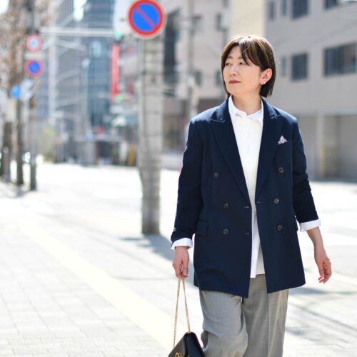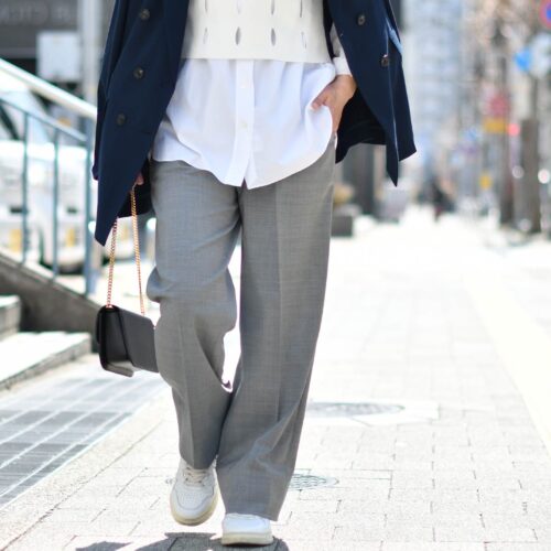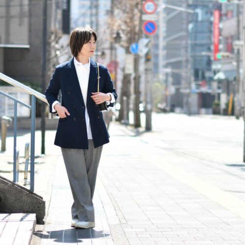 ネイビージャケット×白シャツ×グレーパンツのコーディネートは