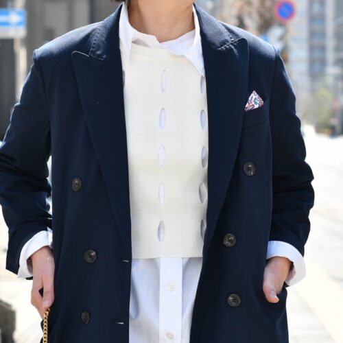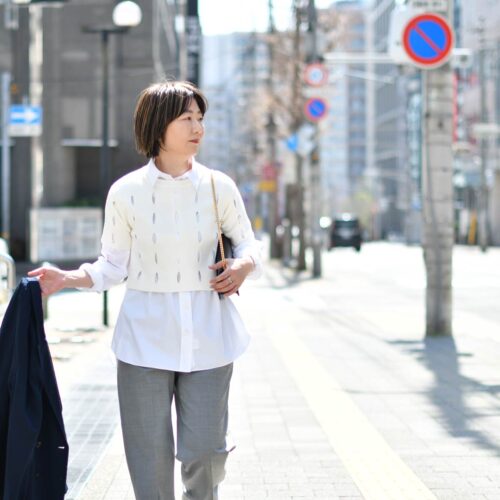 コンパクトニットをインナーにレイヤードして鮮度アップ。