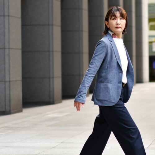 ネイビーパンツとのコーディネートでクリーンで凛とした雰囲気に。