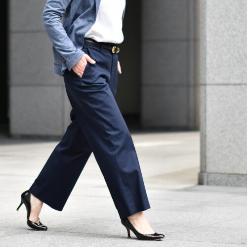 タックなしのすっきりとした腰まわりに、ウエスト位置も高め、