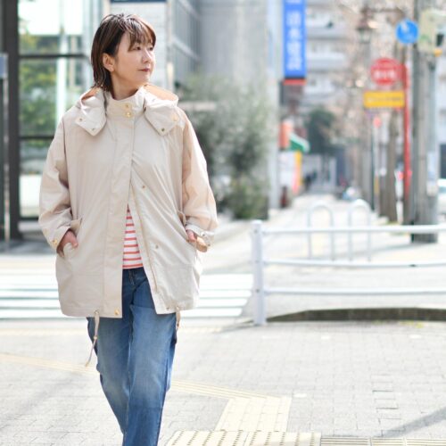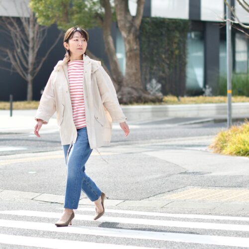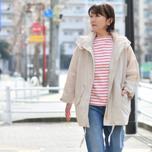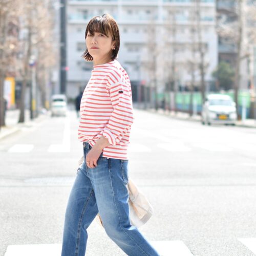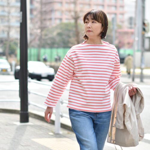 コーラルピンクのボーダーとも相性よく、春を感じるスタイルに。