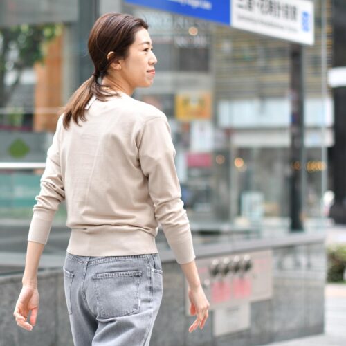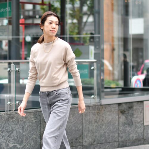トップスはアーモンドカラーのJOHNSMEDLEYのニットを!