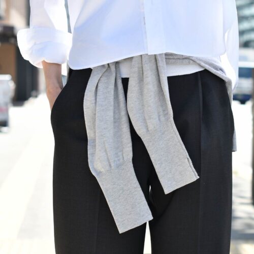 腰位置にはグレーのニットをアクセントにリラックス感をプラス致しました。