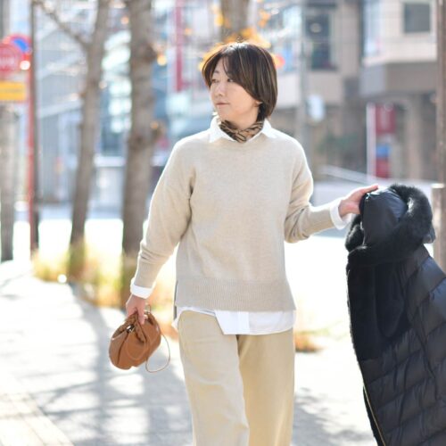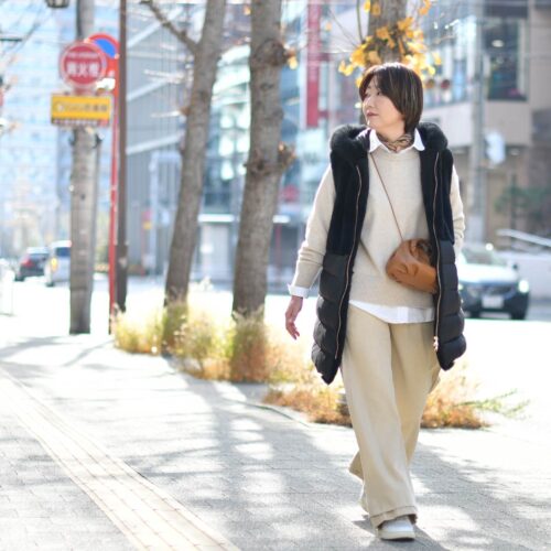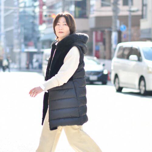 EMMETIのムートンコンビのダウンベストは、スポーティーになり過ぎず