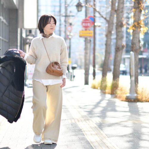 白シャツや茶系のスカーフ、バッグで小気味よく。