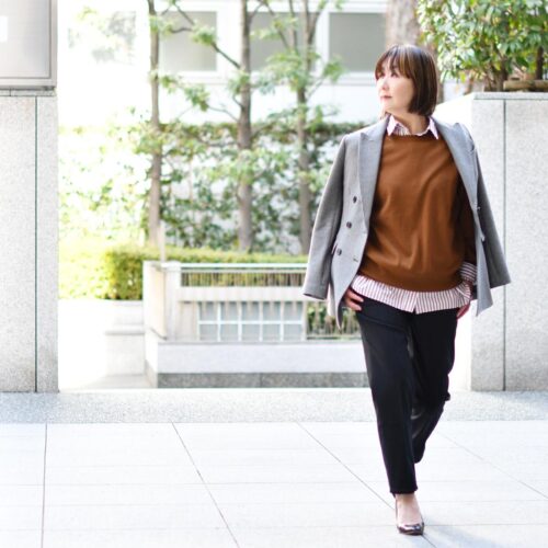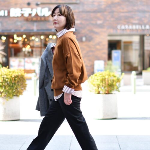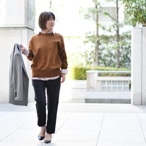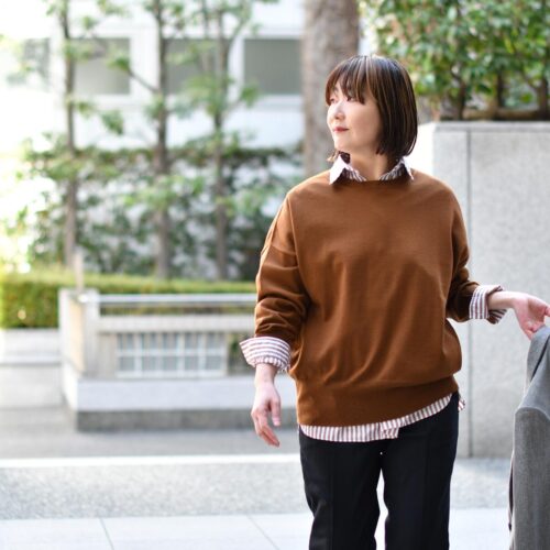 コックリとしたブラウンキャメルのニットをあわせてマニッシュに。