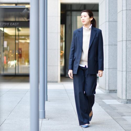 ボトムも同素材のワイドパンツでスーツスタイルとして