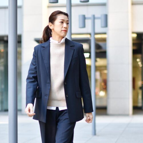 着丈の長さや構築的なディテールが今のトレンド感を出してくれるPTTORINOのテーラードジャケット。
