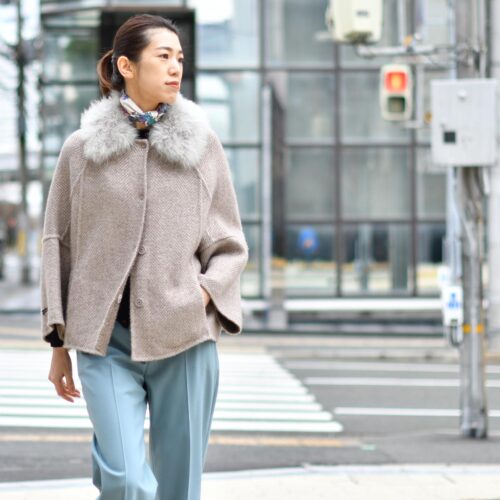 ポンチョの様な軽さのあるコートでエレガントにスタイリング致しました。