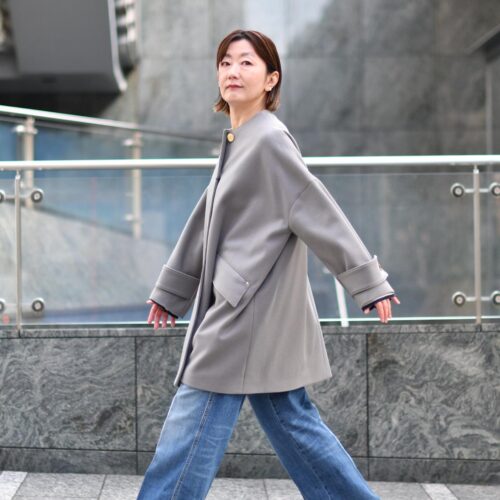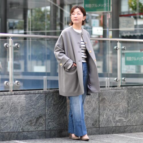 首まわりがスッキリみえるMACKINTOSHのノーカラーコートも