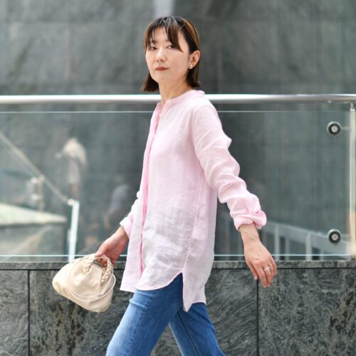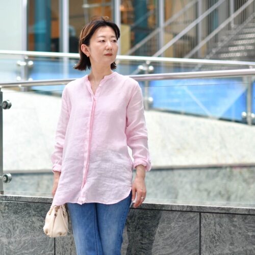 Baguttaのリネンシャツはバンドカラーのスッキリとした顔まわりに