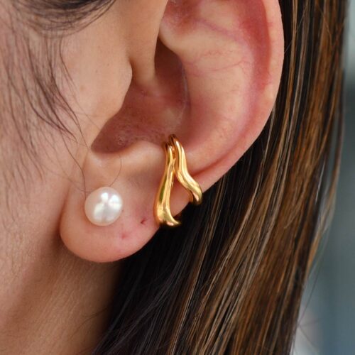 イヤーカフとピアスの重ね付けで、さりげなく盛り気味に。