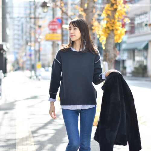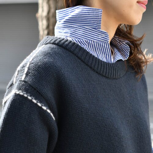 ザックリシルエットに白ステッチが効いたニットは