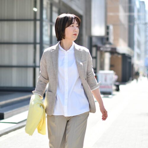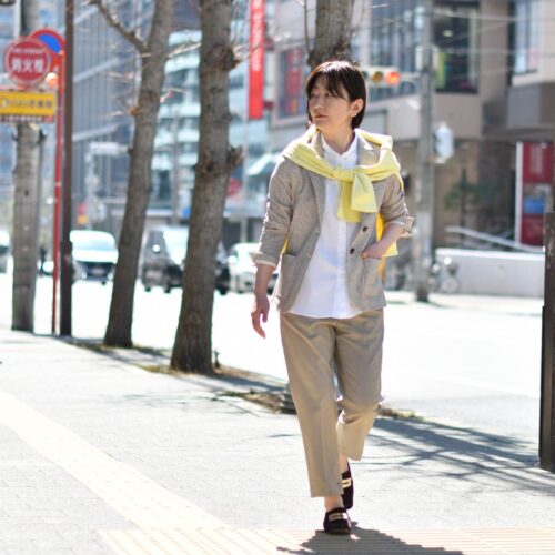 同系色のBRIGLIA1949【ブリリア1949】のパンツをあわせてセットアップ風に。