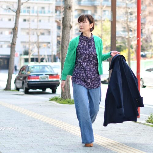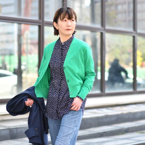 グリーンのカーディガンはお袖を通しても肩掛けでも